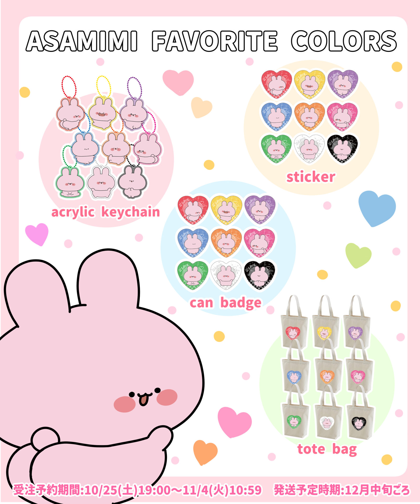 初登場の「ASAMIMI FAVORITE COLORSシリーズ」では、アクキーやステッカー、缶バッジ、トートバッグを推しカラーをテーマにご用意しております🎨💕🐰