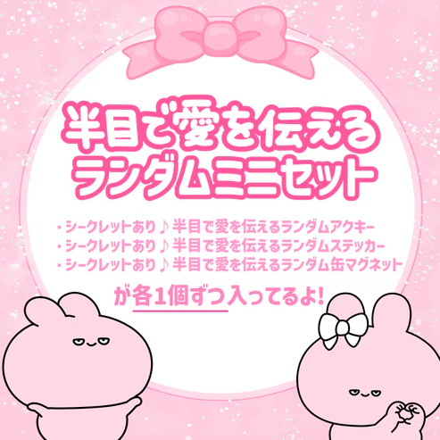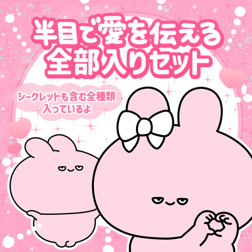 シークレットアイテムを含む、半目で愛を伝えるシリーズの全アイテムが入った「全部入りセット」と、ランダムアイテムが1つずつ入った「ランダムミニセット」もございますので、お見逃しなく❣️
