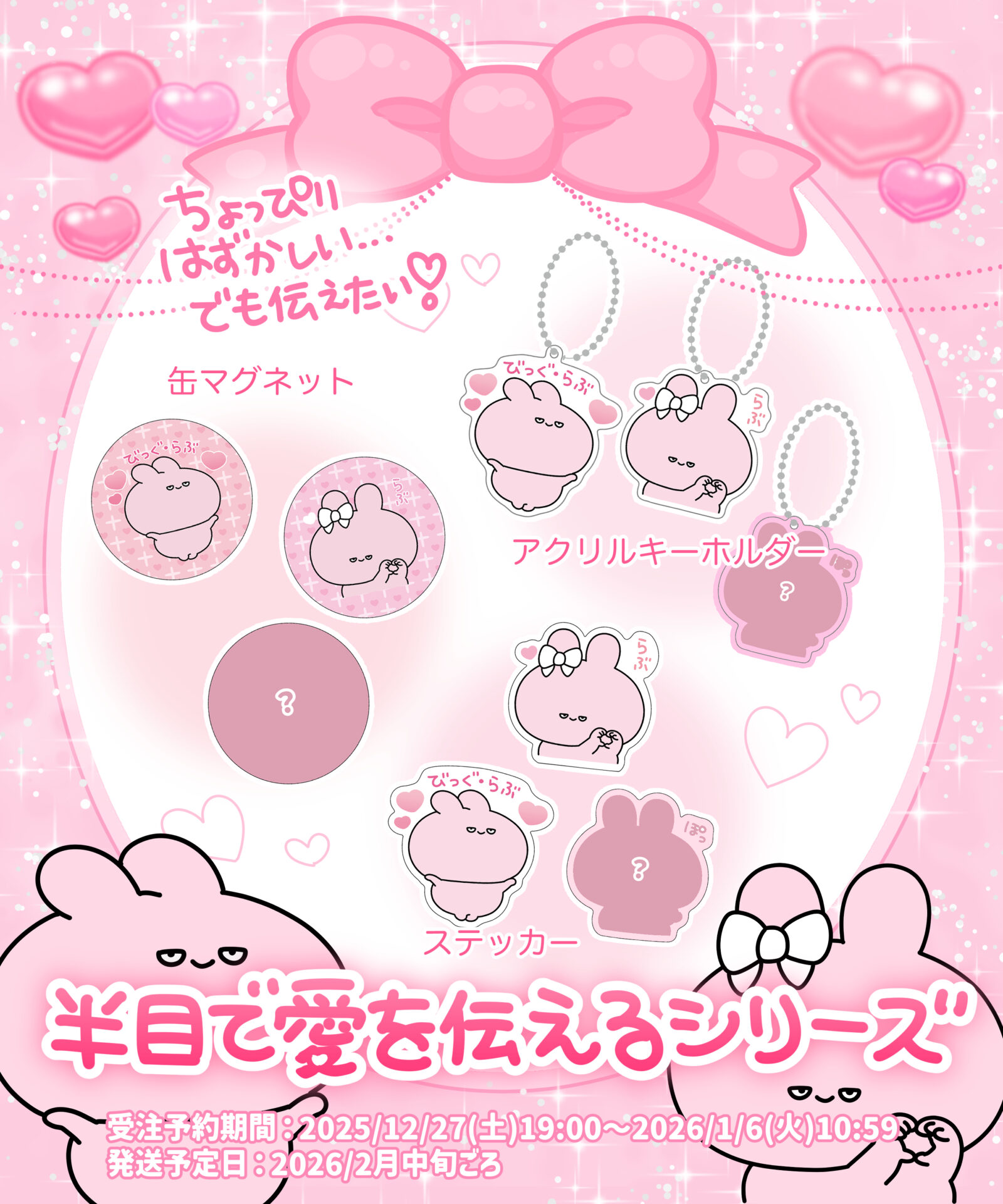 「半目で愛を伝えるシリーズ」では、アクキーステッカー缶マグネットをランダムアイテムでご用意しております🎨💕🐰